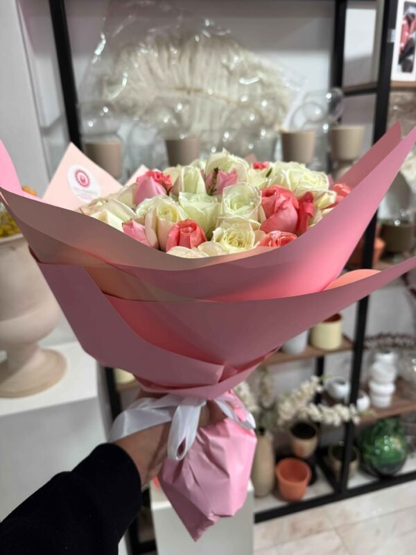 D’abord, les roses crème forment une base lumineuse et raffinée. Leur teinte douce évoque la bienveillance, la gratitude et la paix intérieure. Ensuite, les roses rose pâle viennent compléter la composition avec légèreté. Leur couleur tendre rappelle l’affection, la douceur et l’amour délicat. Ensemble, ces deux nuances pastel créent une harmonie visuelle équilibrée et reposante, idéale pour apaiser le regard.