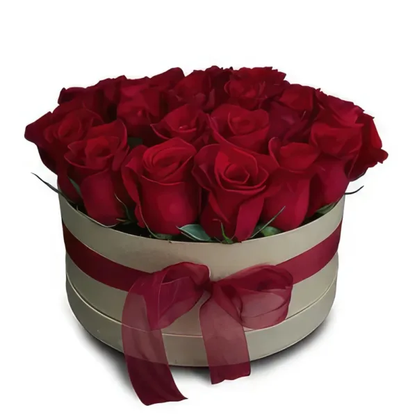 Une boîte circulaire débordante de roses rouges, un geste romantique qui capture l’essence même de la passion pour un amour inoubliable.