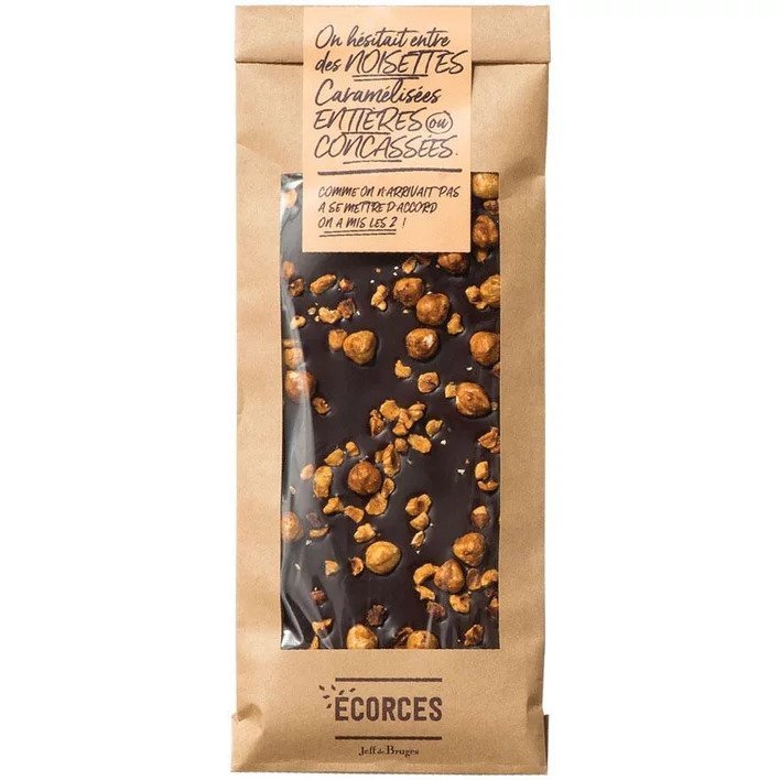 L’Écorce Gourmande aux Noisettes Caramélisées est une véritable création culinaire, fusionnant la richesse du chocolat noir avec l’abondance des noisettes. Cette tablette exceptionnelle est richement garnie de noisettes entières et hachées, caramélisées, procurant une croquant inégalable à chaque morsure. Le chocolat noir intense offre un fond riche qui équilibre idéalement la douceur et le goût des fruits secs.