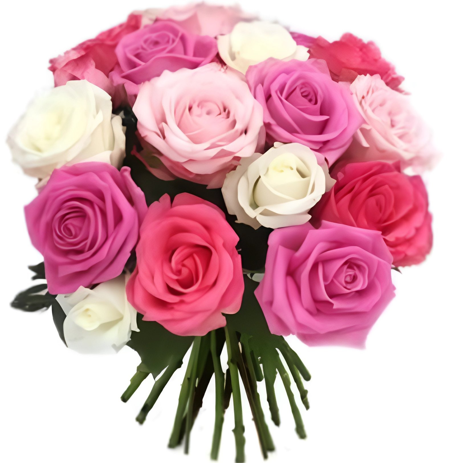 - Fleurs Principales : Roses de différentes nuances de rose (fuchsia, rose moyen, rose pâle) et roses blanches.
