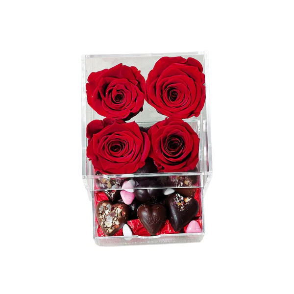 Quatre superbes roses rouges éclatantes, emblèmes éternels de passion et d’amour, sont préservées dans le compartiment supérieur. Leur beauté reste intacte derrière la transparence de la boîte. Sous le tiroir se cache un véritable trésor de saveurs, rempli de chocolats raffinés et variés. On découvre des chocolats en cœur ornés de délices croquants, des friandises marquées ‘JB’ et de mini sucreries en forme de cœur, apportant une note ludique et romantique.